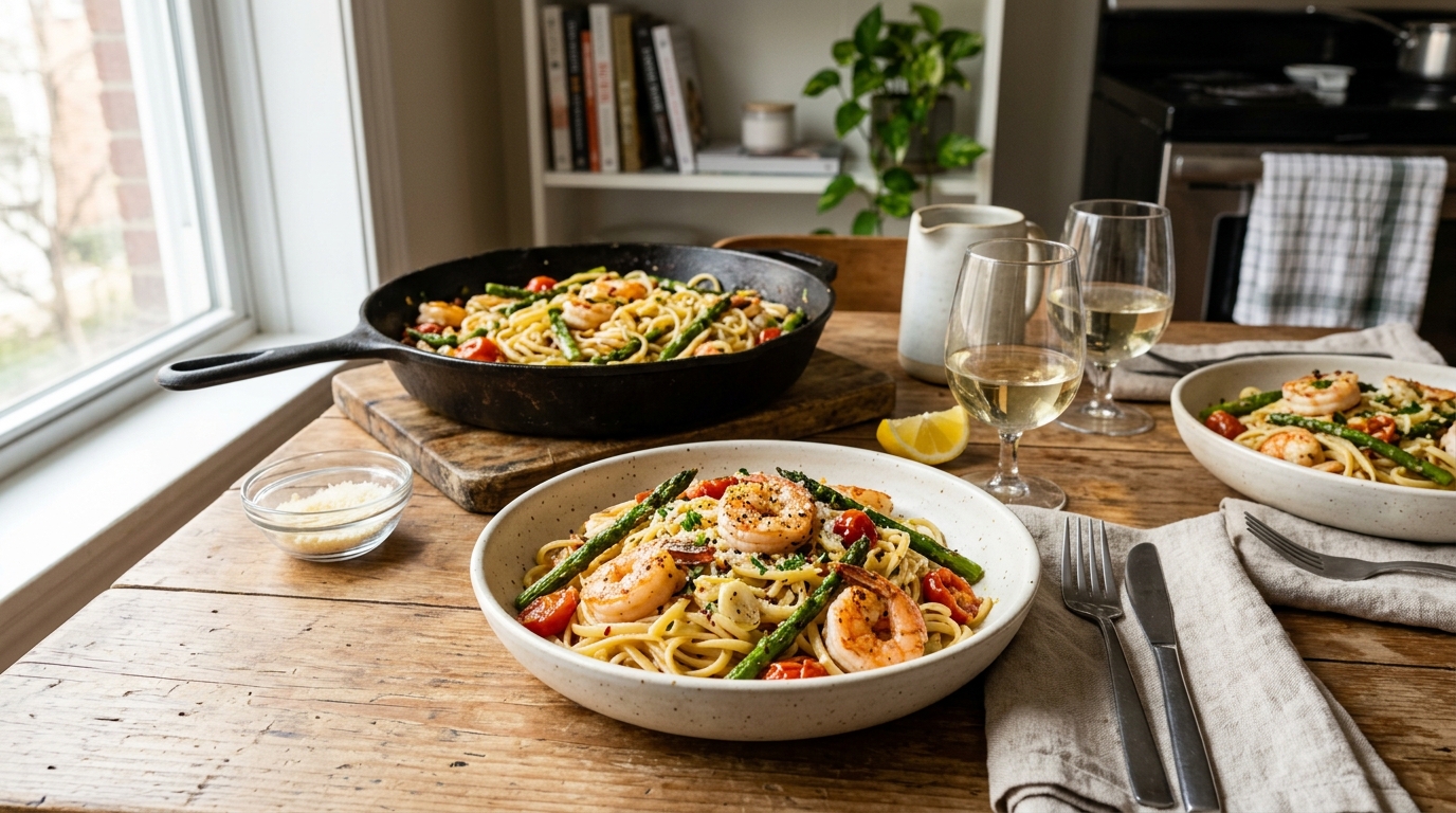 This elegant one-pan meal features succulent shrimp sautéed with fragrant garlic, fresh lemon juice, and a touch of butter tossed with al dente linguine. It is a quick and refreshing dinner that combines bright citrus notes with a silky, light sauce for an effortless weeknight meal.